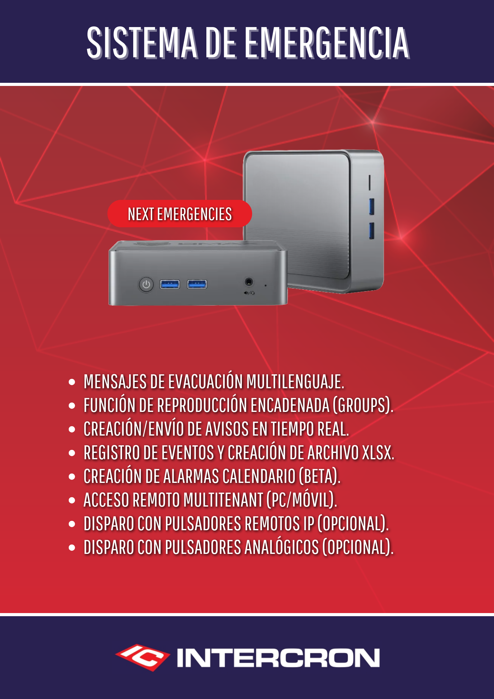 Next! Emergencies es una herramienta indispensable para quienes buscan una solución sólida que les permita optimizar sus procesos y sus recursos. Permite crear, editar, encadenar y disparar mensajes pregrabados en caso de siniestro (incendio, inundación, fuertes vientos, terremoto, robo, etc).