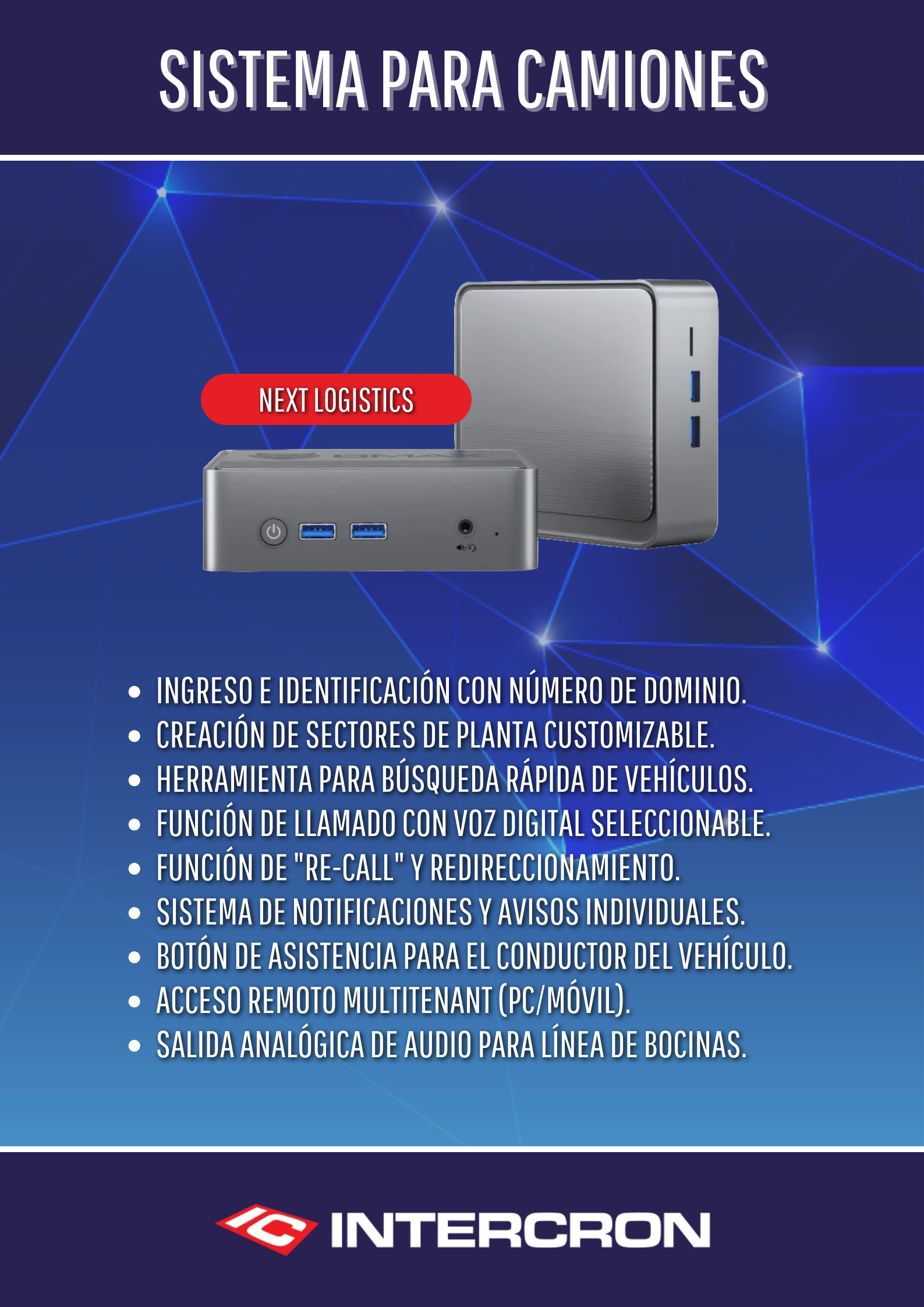 "Next Logistics". Un software que optimiza la forma tradicional de llamado donde se utilizan sistemas de audio busca personas, mejorando la experiencia general del usuario, agilizando el movimiento de los camiones dentro del establecimiento y evitando inversiones de alto coste.