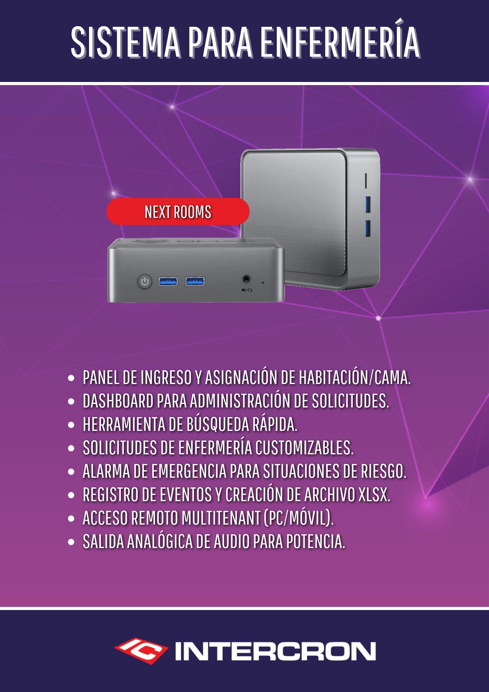"Next Rooms". Una versión digital moderna de nuestro famoso sistema de intercomunicación para enfermería que desde hace más de 20 años se encuentran en los hospitales más famosos de argentina y de Latinoamérica.